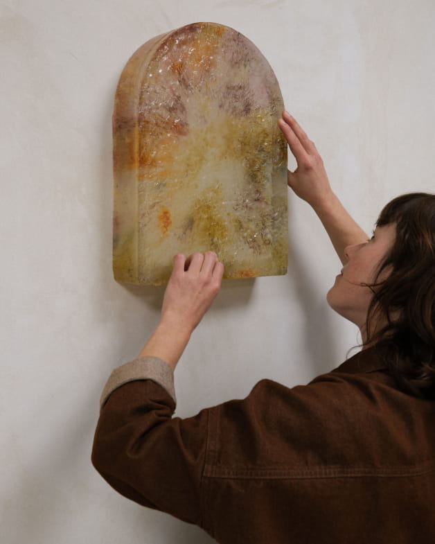 Je verkent een grote diversiteit aan technieken — églomisé glas, gravure, thermoforming, oxidatie, zandstralen… Hoe kies je welke je gebruikt voor een werk? Laat het materiaal je leiden of het licht dat je wilt onthullen?