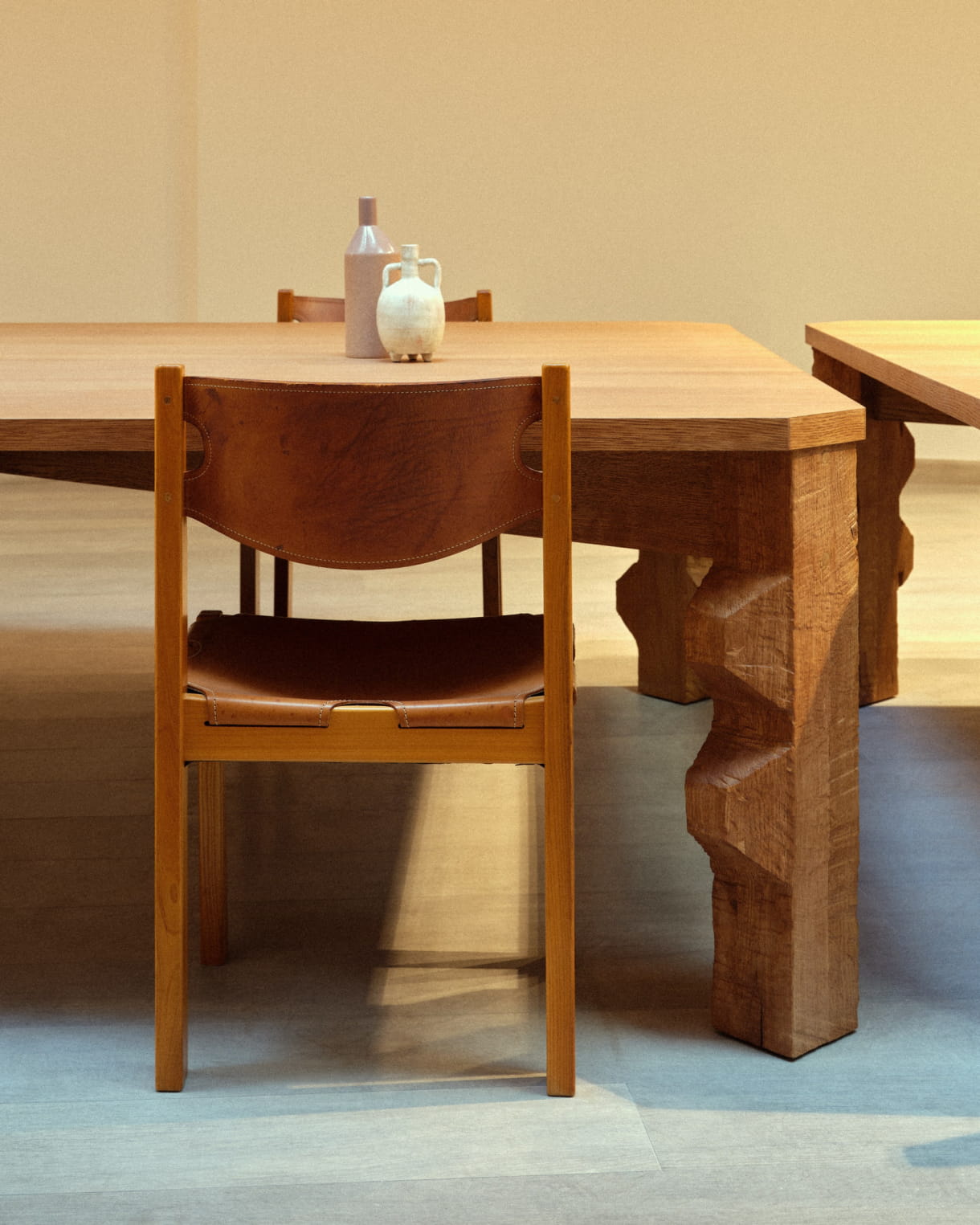 De werkplaats van Carlès Demarquet, eveneens gevestigd in Marseille, heeft drie grote massief eiken tafels van 2,60 bij 1,80 meter gemaakt, bedrukt met brutalistische en primitivistische referenties. Het equivalent van een halve eik uit Bourgondië uit een duurzaam beheerd bos was nodig om deze uitzonderlijke stukken te maken, bewerkt met een kettingzaag.