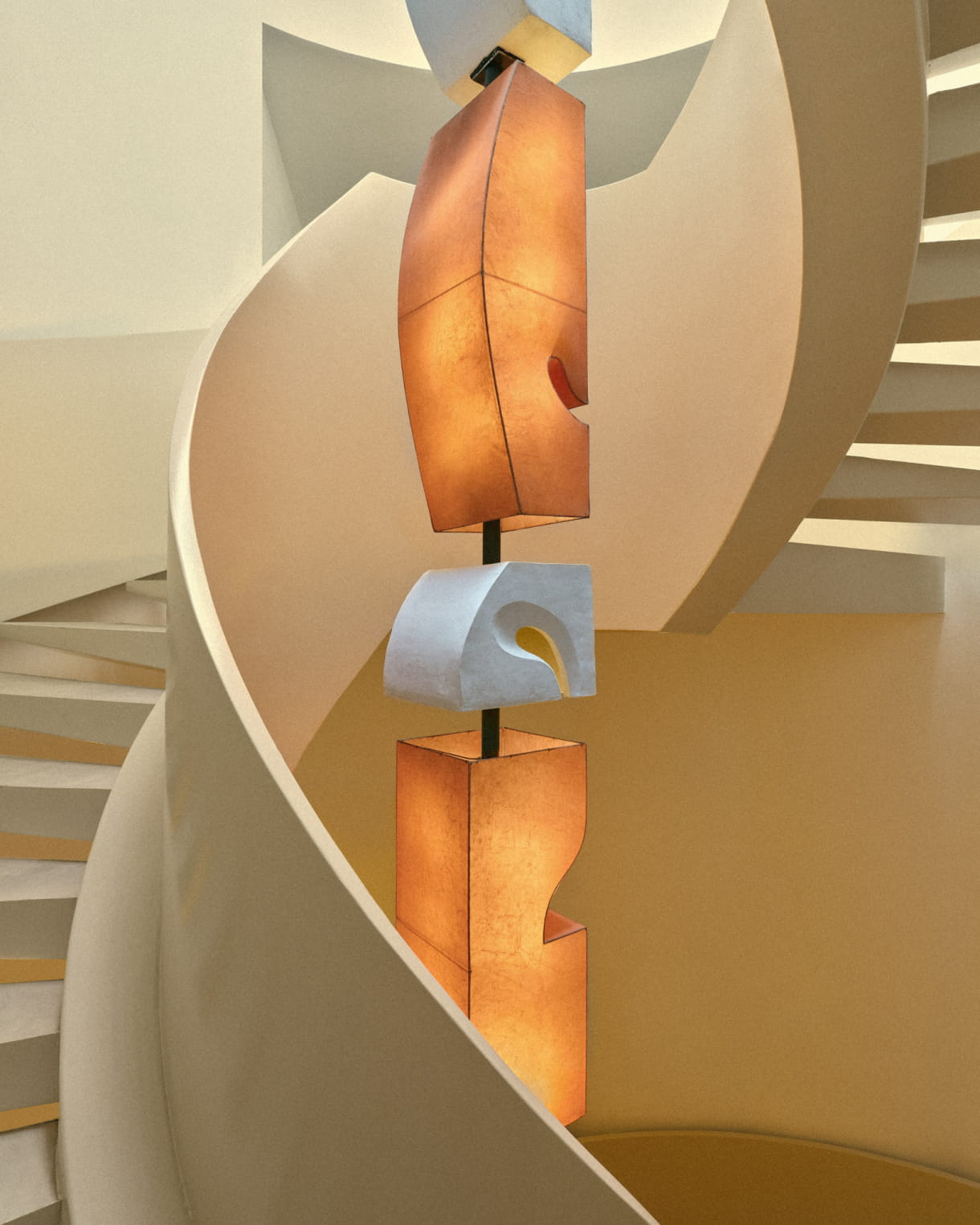 Voor de hoofdtrap vroegen we Léa Bigot om een bijzonder werk te bedenken. Vanuit haar atelier in Marseille ontwierp en vervaardigde ze Taounete: een 9,80 meter hoge totem, opgebouwd uit 14 modules van steengoed en textiel. Samuel Bertin, sinds 40 jaar gespecialiseerd in het maken van lampenkappen, ontwierp de metalen structuren die de stoffen van Azur volgens plantaardige verftechnieken bevatten. 3 maanden werk waren nodig om dit collectieve werk te realiseren, waardoor de waarde van ambachtelijk werk werd gemeten.