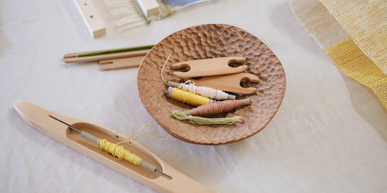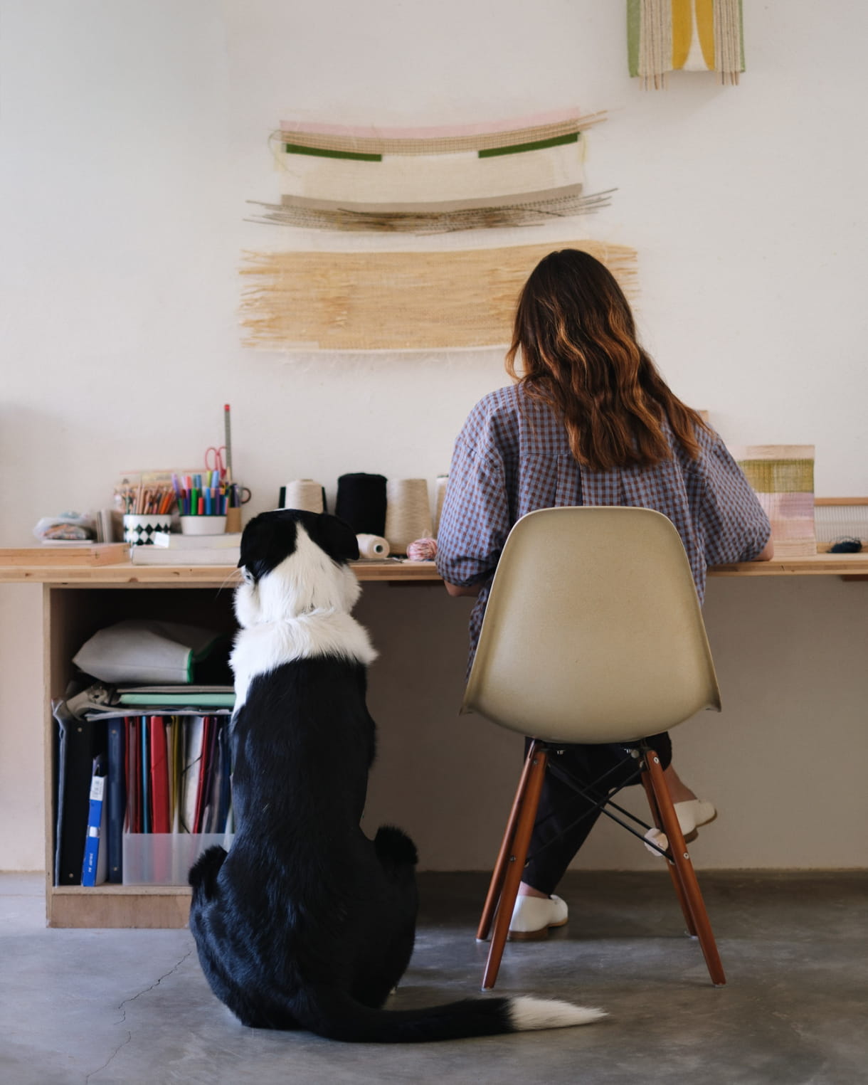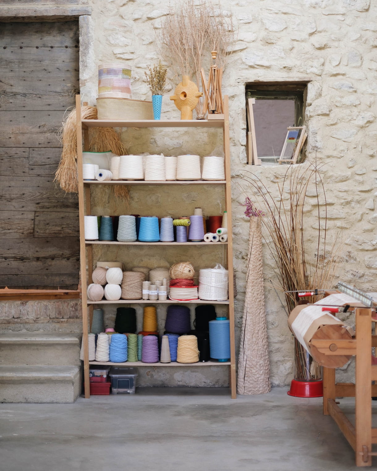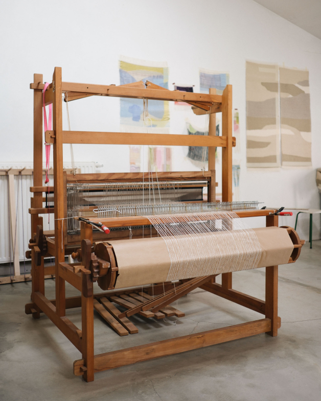 Daar staat een oud houten weefgetouw, omringd door mijn weefgereedschap, zoals weefschuiven en klossen met natuurlijke garens (linnen, papier, hennep, wol). De muren zijn vaak beplakt met lopende projecten of onderzoeken, weefmonsters en vooral tekeningen. Ik heb ook een ruimte ingericht als mijn ‘kleurenlaboratorium’ voor het bereiden van de inkt. Er zijn gedroogde planten, een weegschaal, pigmenten, bakjes en penselen te vinden. En natuurlijk een paar kunstboeken die mij dagelijks inspireren… Een boek van Etel Adnan of een gids over natuurlijke kleuren ligt altijd binnen handbereik.