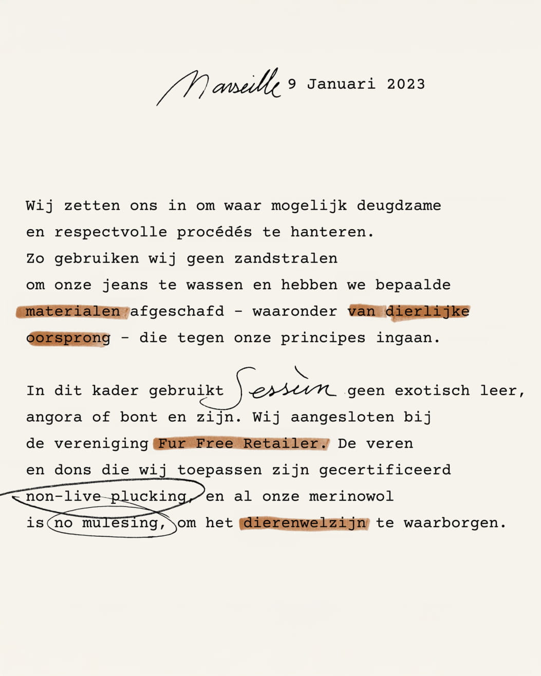 Collectie na collectie geven we de voorkeur aan materialen van natuurlijke oorsprong, zoals katoen, linnen of wol, die we kiezen voor hun duurzaamheid en eigenschappen, maar ook omdat het hernieuwbare grondstoffen zijn.